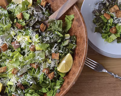 Creating a creamy, silky smooth Caesar salad dressing starts with blending egg yolks, anchovies and garlic with lemon juice, dry mustard, red wine vinegar, extra virgin olive oil and black pepper. This homemade dressing pairs well with a fresh Brussel sprouts Caesar salad.