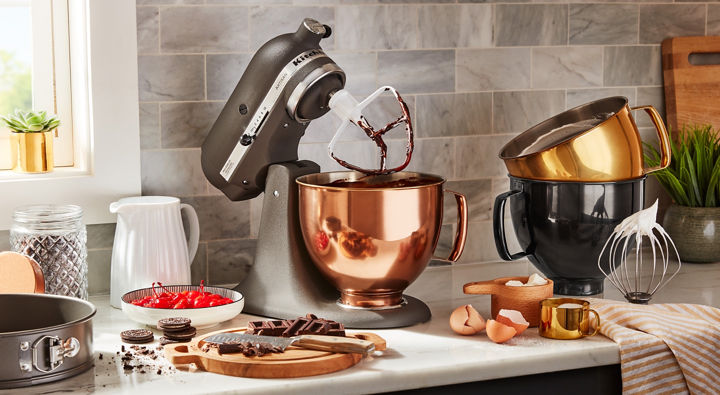 The versatility of mixing bowls allows you to have flexibility when it comes to choosing your kitchen appliances. Ceramic and copper bowls are also examples of materials that you can use to create delicious doughs and pastries. Ceramic bowls for your stand mixer come in a variety of styles, making them ideal for spicing up your countertop’s look.Consider adding a floral accent to your kitchen with this KitchenAid® White Gardenia Ceramic Bowl, or add a pop of color with this KitchenAid® Tropical Floral Patterned Ceramic Bowl.For those looking for a unique aesthetic for their KitchenAid® stand mixer bowl, copper is also an option. The 2022 Design Series Blossom Tilt-Head Stand Mixer features a hammered copper bowl that develops a unique patina over time, reflecting your growth as a Maker.