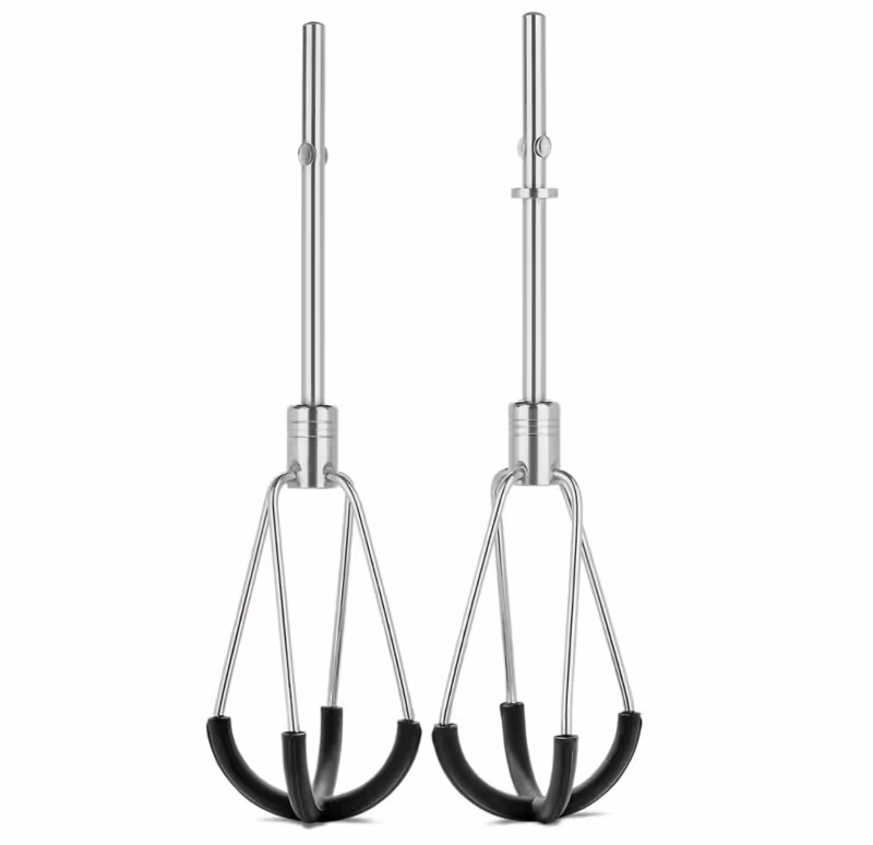 Stainless Steel Turbo Beaters™ are self-cleaning, as they are designed with no center rod. They are great for mixing dense ingredients like chunky macadamia nut cookie dough and decadent crumb cake batter. The beaters are the most versatile of the hand mixer attachments.