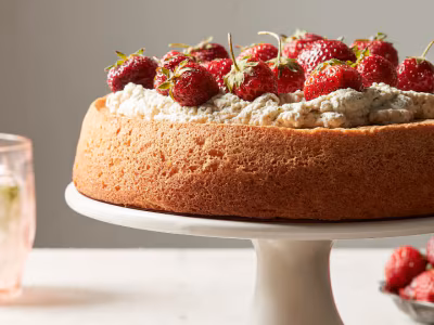 Classic chiffon cake with basil whipped cream and strawberries