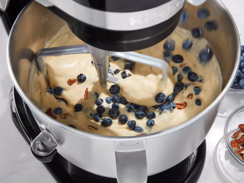 You can whip up a batch of blueberry muffin batter in minutes with a KitchenAid® stand mixer by your side. Follow the recipe below to create fluffy, tender muffins with the help of your stand mixer and attachments designed to mix and sift with ease.