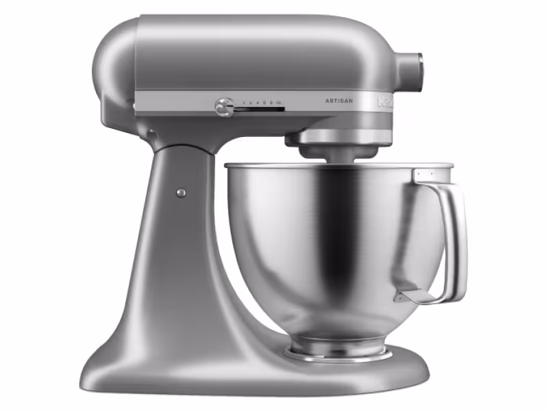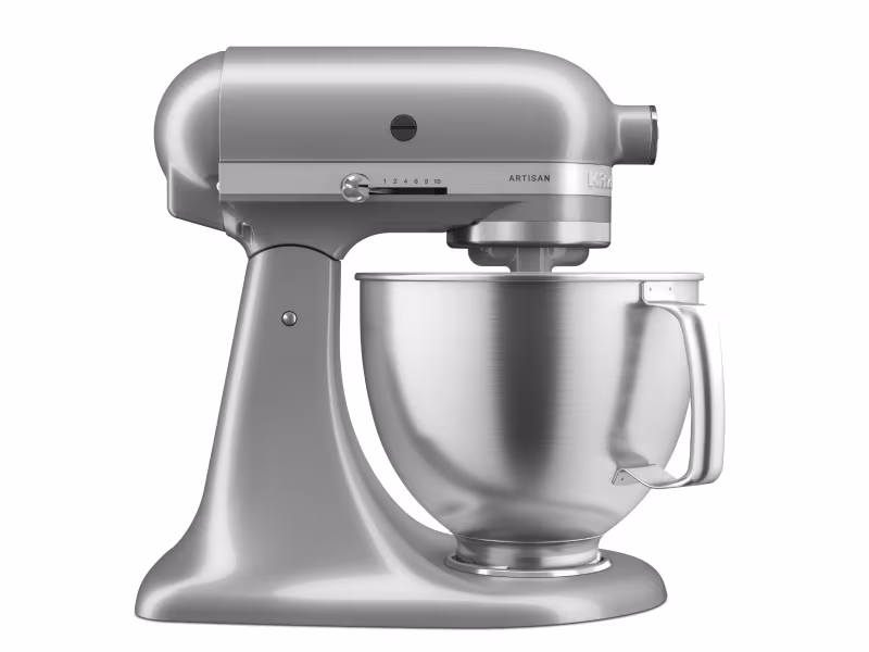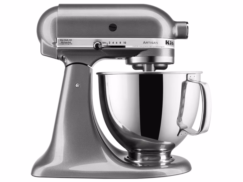 The metallic chrome KitchenAid® stand mixers are a lighter shade of chrome gray within the Artisan® series. This stand mixer has a light metallic sheen, but its light gray color makes it a conservative and practical addition to the kitchen.