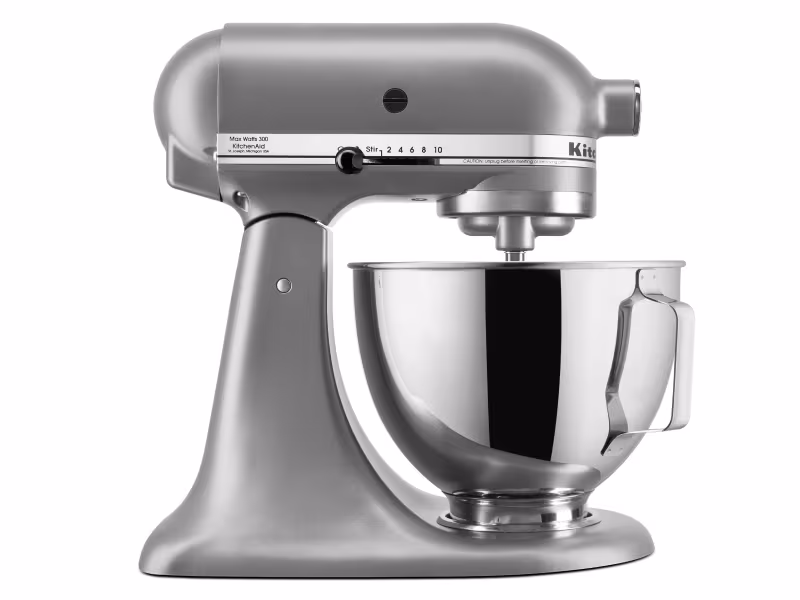 The silver KitchenAid® stand mixers are the lightest color from the gray and metallic collection of KitchenAid® stand mixers. This light shade can pair well with other neutral tones, specifically white and black color schemes, where it can subtly stand out.