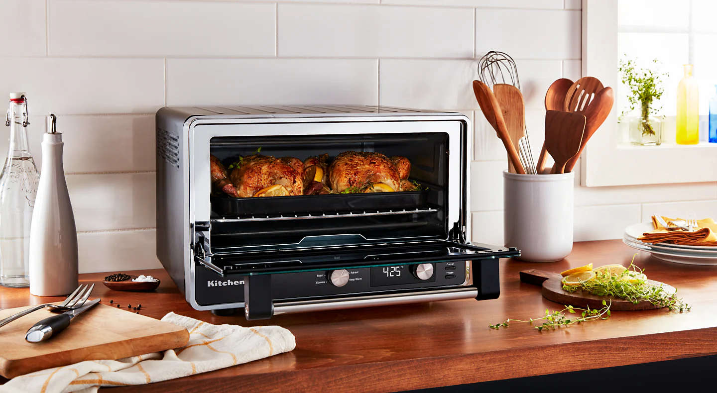 Toaster ovens on the market today vary widely. They are usually designed to hold slices of bread for toasting or a dish for reheating, among a few other functions. Toaster ovens can be a great choice for very small kitchens or simple tasks. Some countertop ovens, like the entire lineup of KitchenAid® countertop ovens, are large enough to hold a 9x13 baking tray.