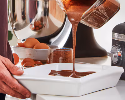 Take the mixture off the burner and pour it over a bowl of milk, white or dark chocolate that has been finely chopped with a KitchenAid® food processor. Let this new mixture sit for five minutes.