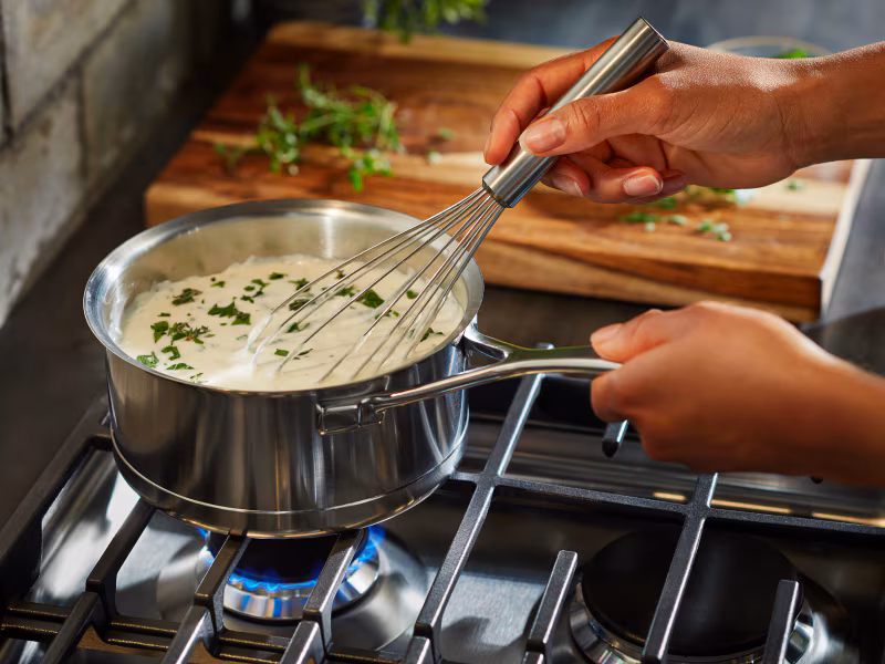 Sometimes called an immersion blender, hand blenders are handheld tools that can be inserted into anything from a smoothie jar to a stock pot to blend the contents. Like a countertop blender, hand blenders can have various speeds to blend or puree a variety of foods with ease. Some hand blenders—like this model from KitchenAid brand—come with additional attachments that can also whip or chop ingredients. While a countertop blender’s capacity is limited, hand blenders can work with your ingredients in any size vessel to tackle small or large batches with precision. Learn more about using an immersion blender.