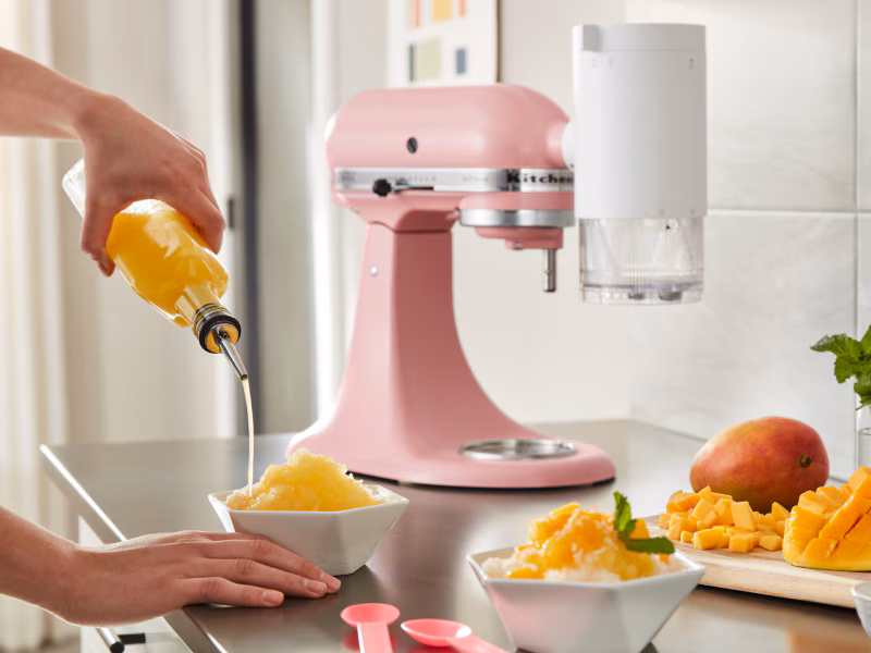 Stand mixers may not come to mind when you think of blender substitutes, but they’re often compatible with attachments that can mimic a blender’s capabilities. The KitchenAid® Fruit and Vegetable Strainer Attachment, for instance, can create smooth sauces and purees for recipes like green bean and pea puree or spiced pear and caramelized shallot jam. KitchenAid® stand mixers are also compatible with the KitchenAid® Shave Ice Attachment1 that can create light and fluffy ice shavings for a range of frozen desserts.